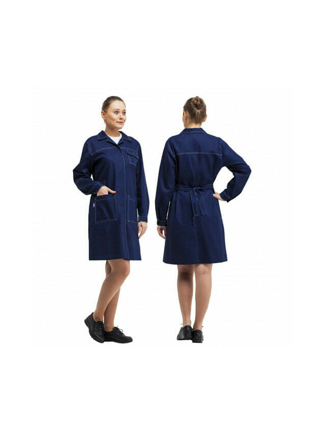 Халат прямого силуэта, с потайной застежкой на пуговицы. Рукава длинные с манжетами, застегивающимися на пуговицы. Отложной воротник. Спинка и полочки с кокетками. На левой полочке расположен нагрудный карман с клапаном, застегивающимся на пуговицу. В нижней части полочек расположены накладные карманы. Спинка со средним швом, с завязывающимся по талии поясом.