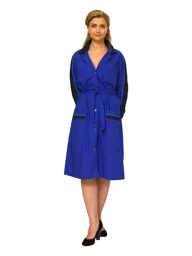 Халат полуприлегающего силуэта с центральной застежкой на пуговицы, отложным воротником, с накладными и нагрудным карманами, рукав - длинный, объем по талии регулируется поясом. Воротник, рукава и карманы с отделочными деталями из контрастной ткани.