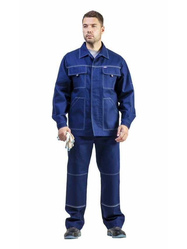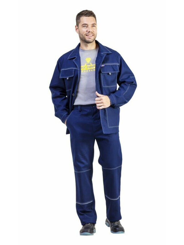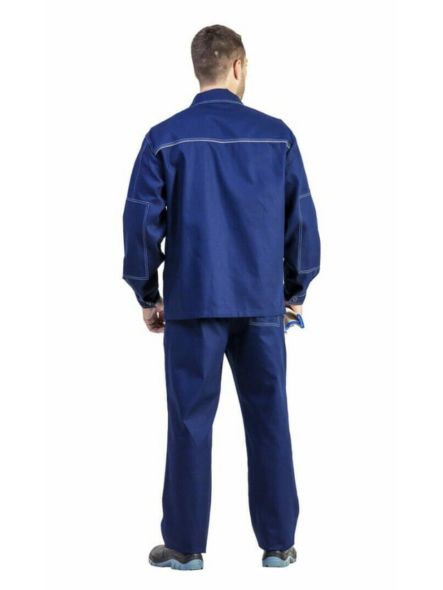 Костюм: куртка и брюки. Удлиненная куртка прямого силуэта, с центральной потайной застежкой на пуговицы, с отложным воротником, рукава с налокотниками. В швах притачивания кокеток на спинке и полочках расположен светоотражающий кант шириной 3мм. Два прямых накладных нагрудных кармана с клапанами, застегивающимися на контактную ленту и два нижних накладных кармана с наклонным входом. Брюки с притачным поясом со шлевками. Два боковых кармана с отрезным бочком, с усилительными накладками, в нижнюю часть которых втачан СВ кант шириной 3мм. Один задний накладной прямой карман. Застежка-гульфик на петли и пуговицы.