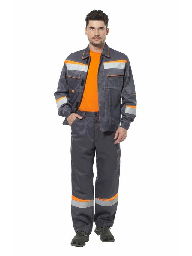 Брюки на поясе с эластичной тесьмой и шлевками для ремня. Центральная застежка на молнию. Два верхних боковых кармана, один карман с клапаном на боковой части, карман для инструментов на задней части брюк. Отделочные элементы и светоотражающая полоса шириной 50 мм в нижней части брюк.