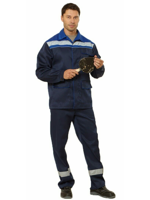 Костюм - куртка и брюки. Куртка с потайной застежкой на пуговицы, кулисой со шнуром для возможности регулирования объема талии. Кокетка полочки и спинки из отделочной ткани. Удобные накладные карманы на куртке и дополнительный нагрудный карман с клапаном. Брюки с застежкой на «молнию». Костюм с лентой СОП 50 мм по низу кокетки и низу брюк.