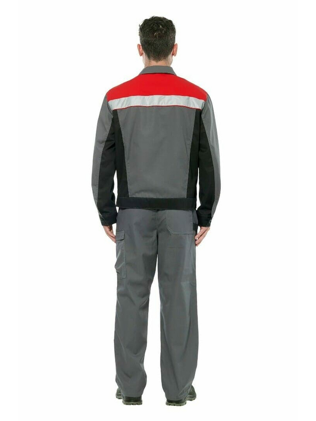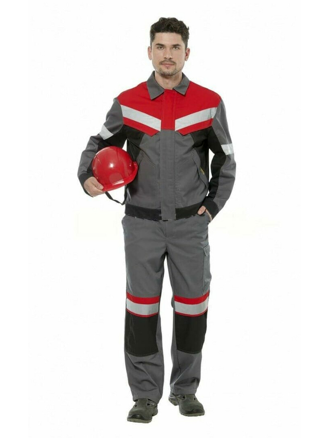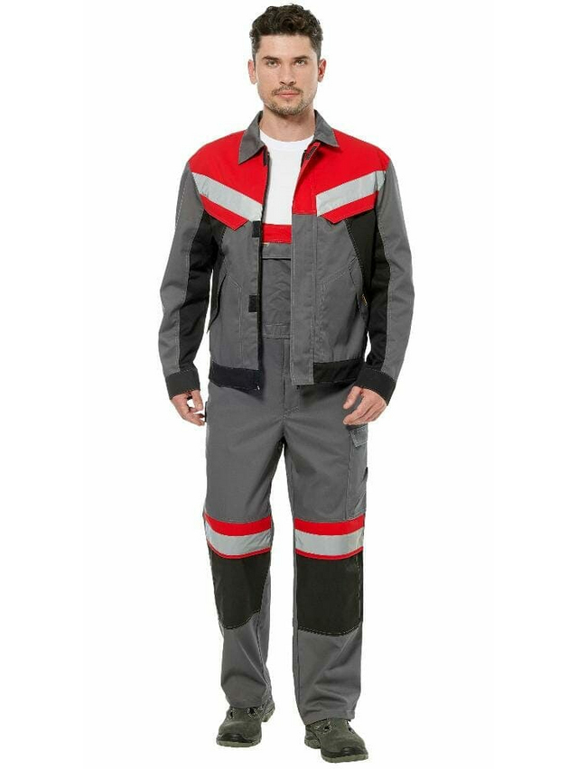 Костюм - куртка и полукомбинезон. Куртка с застежкой на «молнию» и пуговицы, кокетка с цельнокроеными клапанами, эффектная отделка из контрастной ткани. Полукомбинезон с застежкой на «молнию» удобными боковыми и накладными карманами для инструмента, усиление в области колен, отверстием для амортизационных накладок, длина бретелей регулируется с помощью фастекса. Костюм с лентой СОП 50 мм на спинке, рукавах, по низу полукомбинезона.
