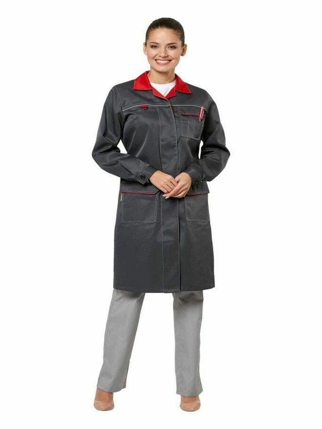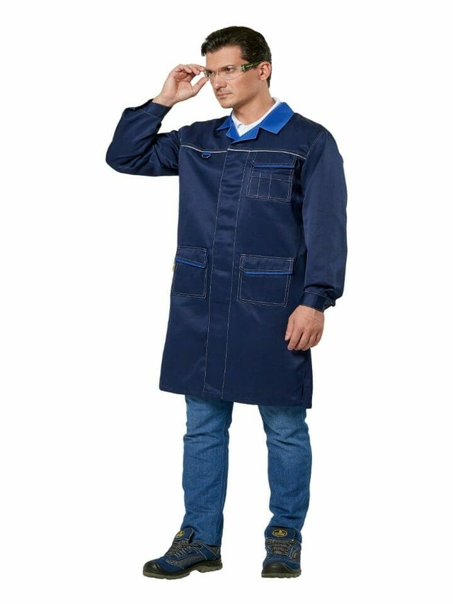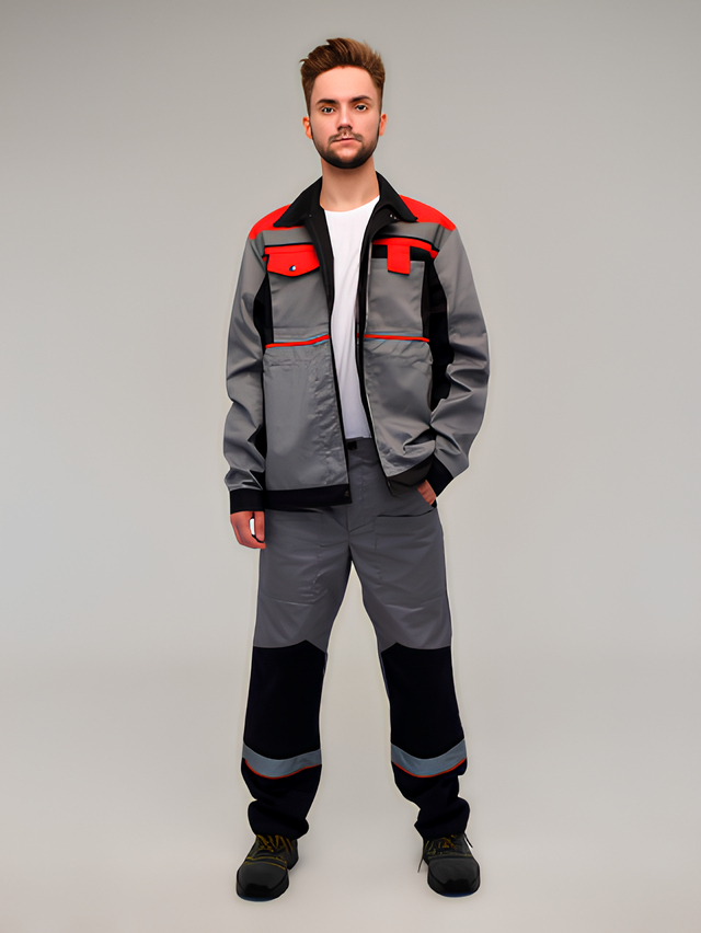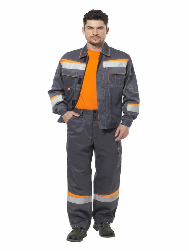 Костюм: куртка и брюки. Куртка с центральной застежкой на молнию и ветрозащитную планку. Два нагрудных накладных кармана с клапанами и два нижних объемных кармана. На левом рукаве карман на молнии. Рукава с манжетами, застегивающимися на пуговицы. Ширина куртки регулируется по низу патами с контактной лентой. На спине, груди и по низу рукавов светоотражающая полоса шириной 50 мм.